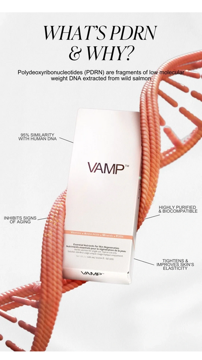 VAMP™ is a bio-revitalizing solution developed by Prollenium, enriched with a blend of vitamins, amino acids, minerals, and PDRN (Polydeoxyribonucleotide) derived from salmon DNA. This treatment is designed to enhance skin tonicity, tighten pores, and minimize wrinkles, promoting a youthful and rejuvenated appearance.